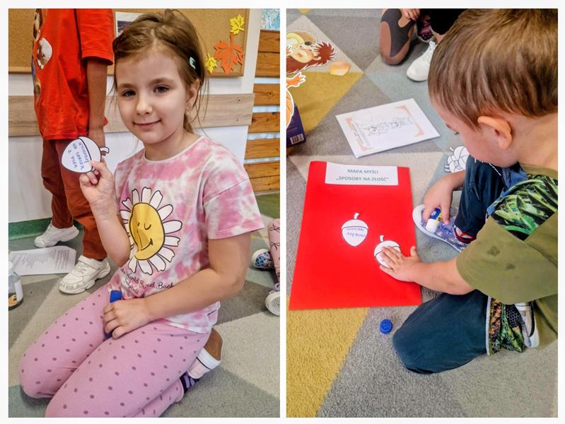 Dzieci wysłuchały bajki terapeutycznej pt. „Łupinka i kłótnia o orzech” następnie porozmawialiśmy o emocjach Łupinki i innych bohaterów. Wykonaliśmy analizę treści bajki przy pomocy pytań pomocniczych. Dzieci wskazały oznaki złości, jej przyczyny i sposoby radzenia sobie z nią. Następnie chętne przedszkolaki odgrywały scenki sytuacji z bajki. Wspólnie stworzyliśmy mapę myśli „Sposoby na złość” zawierającą pomysły na konstruktywne sposoby radzenia sobie ze złością. Dzieci wykonały pracę plastyczną pt. „Moja złość” próbując zobrazować emocje złości. Na zajęciach wykonaliśmy ćwiczenie sensoryczno-ruchowe „Pudełko złości”, które pozwoliło nam poznać rekwizyty i karty z technikami radzenia sobie ze złością. Podsumowaniem i refleksją było wspólne omówienie morału bajki, wysunięcie wniosków dotyczących przyjaźni i radzenia sobie ze złością. Ewaluacją naszych zajęć był „Słoik Emocji Łupinki”, do którego dzieci wybierały emotikonę odpowiadającą ich aktualnym emocjom i wrzucały ją do słoika. Razem z wiewiórką Łupinką zauważyliśmy, że złość jest jak skorupka orzecha – twarda, szorstka, czasem kłująca, ale w środku często kryje się coś zupełnie innego. Pod tą „skorupką” mogą ukrywać się różne emocje i potrzeby – smutek, tęsknota, poczucie niesprawiedliwości albo pragnienie, by ktoś nas zauważył i docenił.