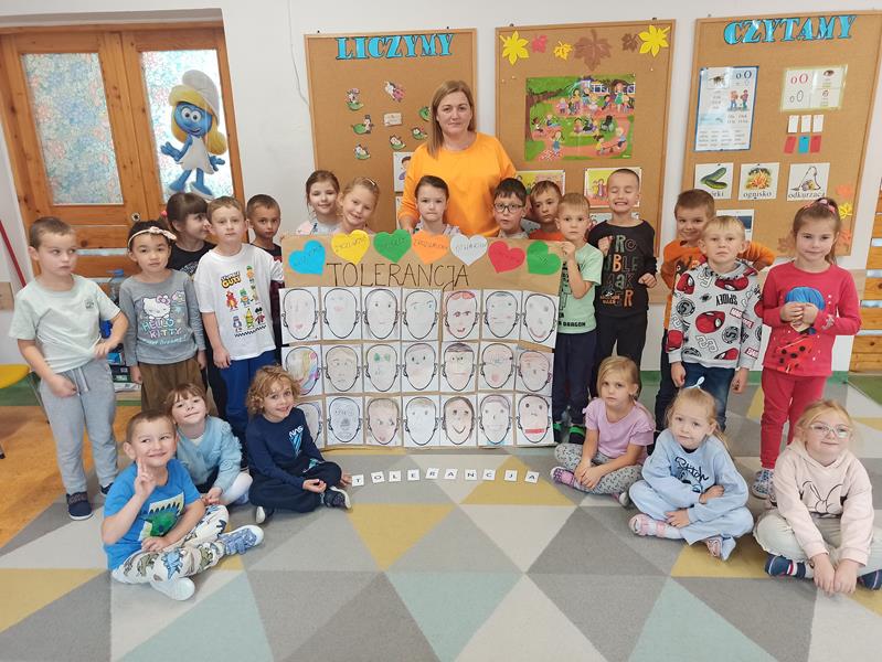 Podczas spotkania wysłuchaliśmy piosenkę o tolerancji, dzięki której mogliśmy dostrzec jak różnorodni i wyjątkowi jesteśmy. Na zakończenie spotkania wykonaliśmy swoje portrety, z których stworzyliśmy grupowy plakat.