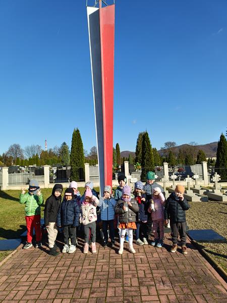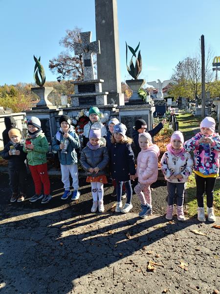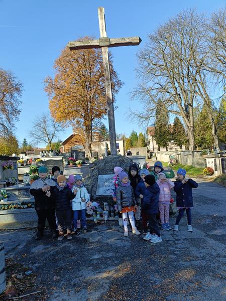 W dniu 31 października dzieci grupy III wybrały się na cmentarz. „ Żabki” wspólnie z paniami pomodliły się i zapaliły znicze przed pomnikami upamiętniającymi bohaterów poległych w latach okupacji czy powstań . Przedszkolaki mogły w ciszy i zadumie posłuchać opowieści wychowawcy na temat przeszłości naszej ojczyzny . W czasie wycieczki dzieci poznały tradycje , zwyczaje związane ze świętem zmarłych w naszej kulturze i religii. Zrozumiały też jak należy zachowywać się na cmentarzu by nie zakłócić spokoju zmarłych i osób odwiedzających to miejsce.