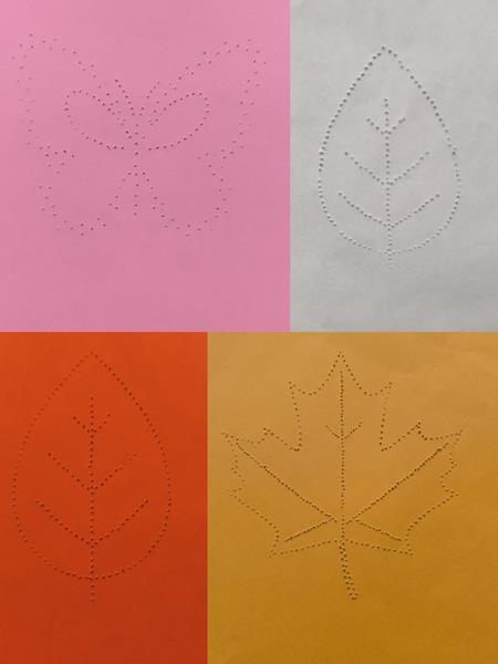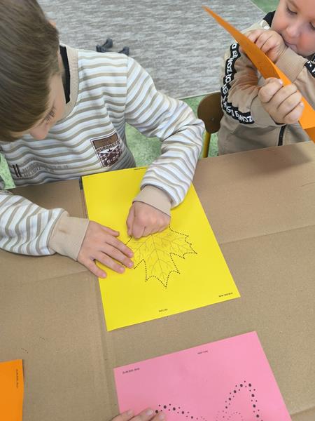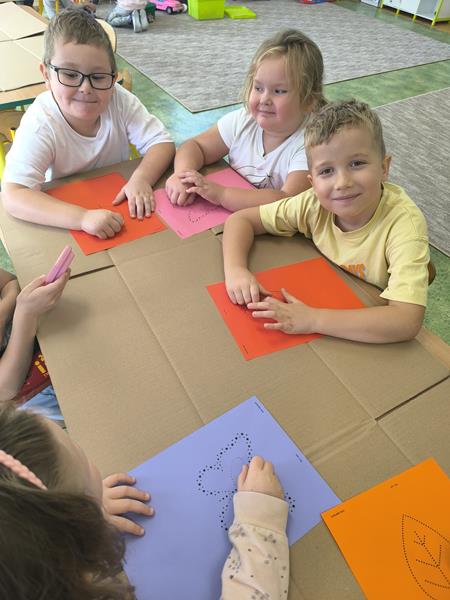 W ramach pierwszego zadania „Perforowanie” dzieci pracowały z przygotowanymi szablonami w kształcie listków oraz motylków. Perforacja odbywała się na kolorowych kartkach nawiązujących do barw jesieni. Dzieci z dużym zaangażowaniem wykonywały zadanie, rozwijając przy tym sprawność manualną, koncentrację oraz wyobraźnię. Działanie to sprawiło im wiele radości i wprowadziło w świat sztuki poprzez zabawę i twórcze działanie.
