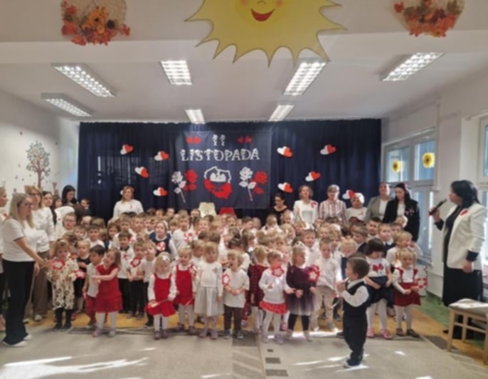 Dnia 7.11 gr. IV przygotowała uroczystą akademię z okazji Narodowego Święta Niepodległości. W trakcie uroczystości cała społeczność przedszkolna wzięła udział w ogólnopolskiej akcji „Szkoła do hymnu”, organizowanej przez Ministerstwo Edukacji Narodowej. Punktualnie