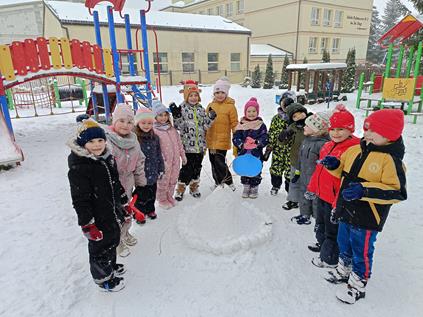 Świetniej zabawy nie było końca, dzieci wykonały śnieżne aniołki, odbyły się zawody w rzucie śnieżka do celu, próba budowy bałwana zakończona powstaniem lodowego wulkanu oraz zjazdy na pobliskiej górce.