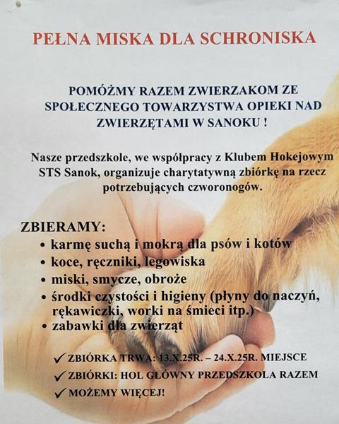 Nasze przedszkole razem z Klubem Hokejowym STS Sanok organizuje zbiórkę dla zwierzaków ze Schroniska w Sanoku.